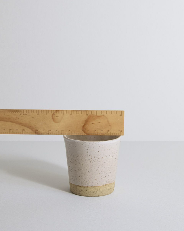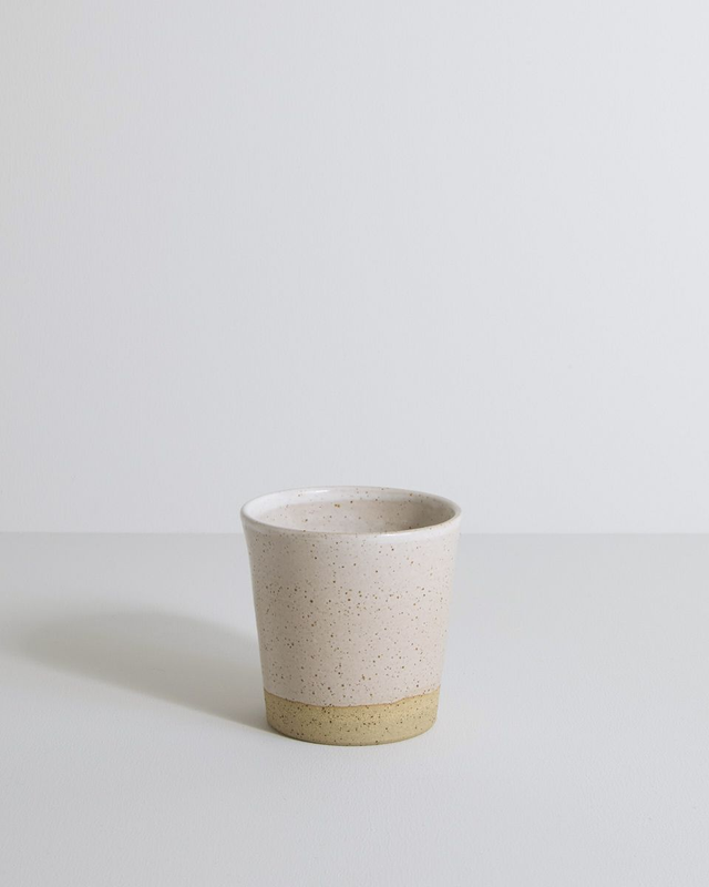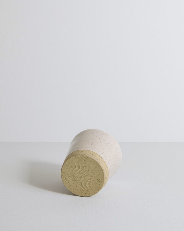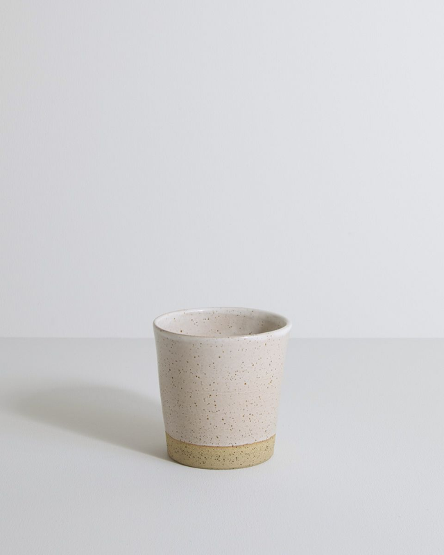 A white cup, perfect for a quick orange juice in the morning. Hand thrown from a buff speckled clay body and finished with a hand dipped white gloss glaze. A delight to drink from.