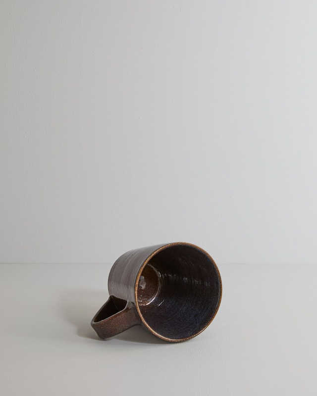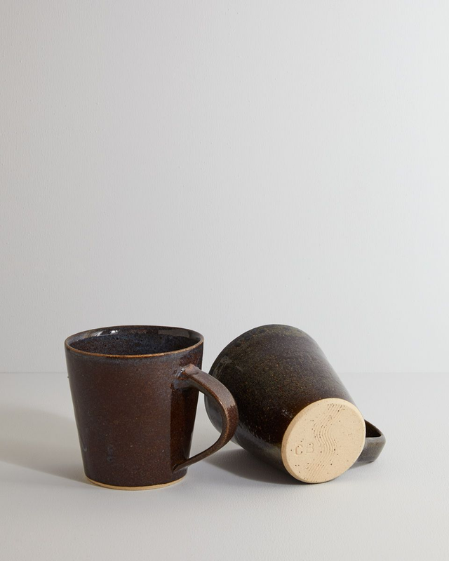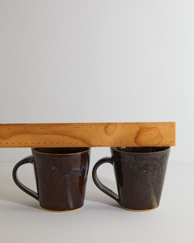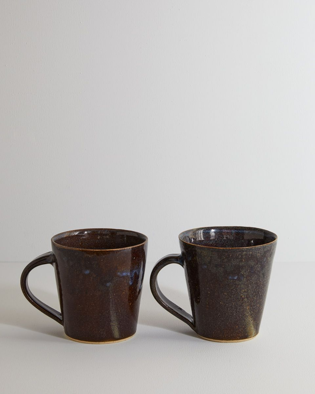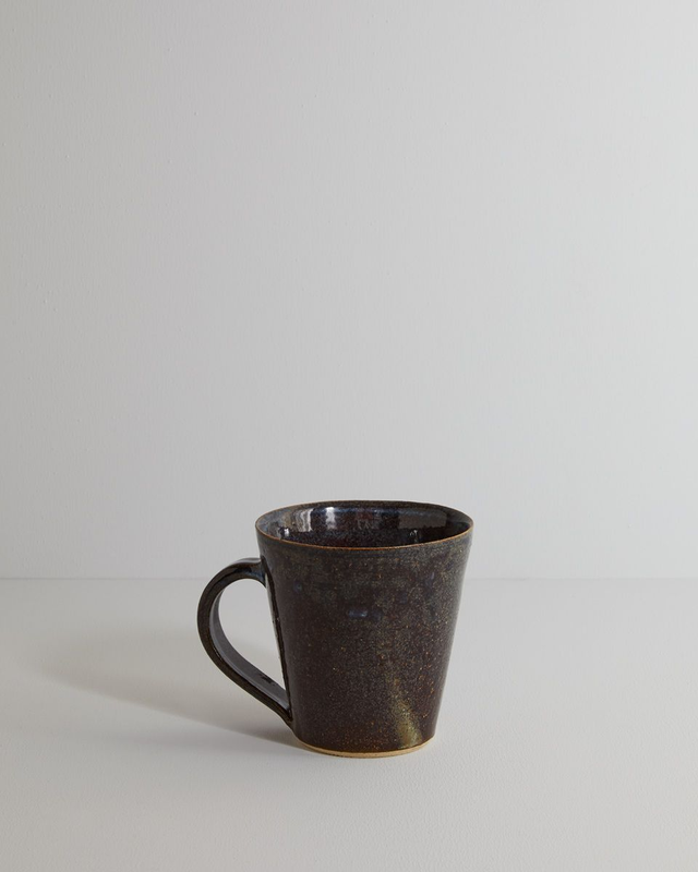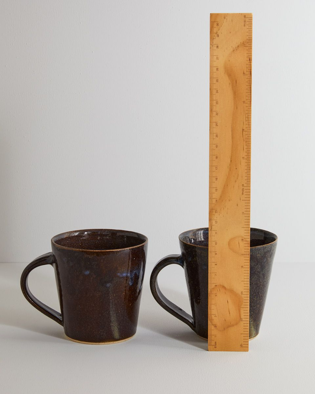 Crafted from a speckled buff clay, each mug is individually hand thrown and finished with a hand pulled handle. The "Blue Mist" glaze is hand dipped and highly variable, producing a beautiful spectrum of colours from rich dark browns to subtle hints of purple, blue, and soft hazy greens. Every firing brings a unique surprise, making no two mugs exactly alike.