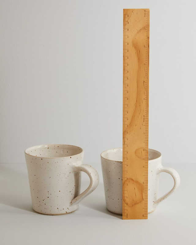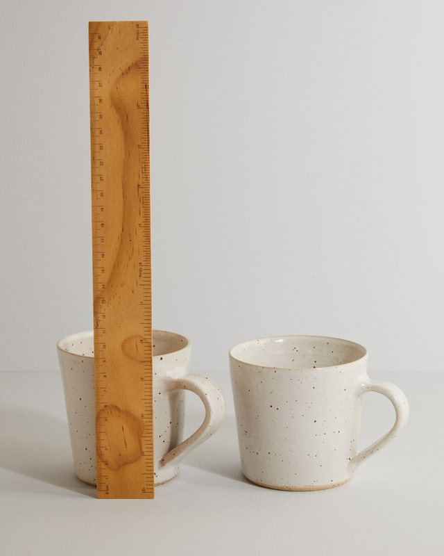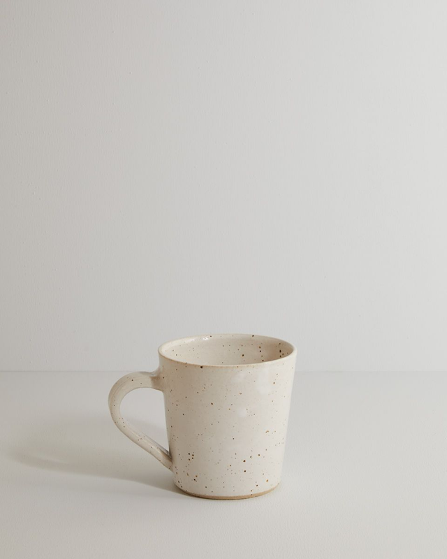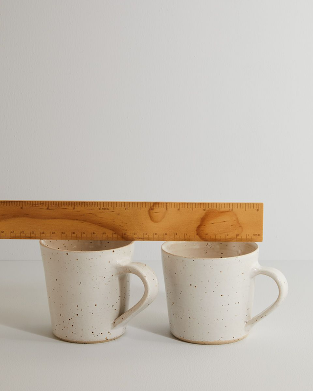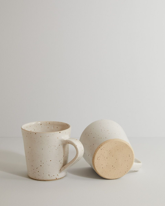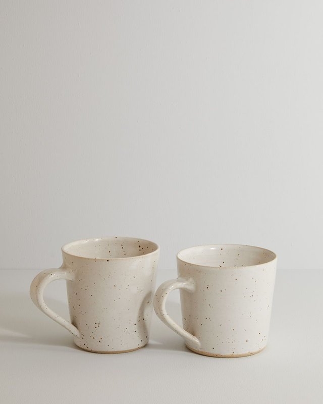 This pair of hand thrown mugs is crafted from buff speckled clay and finished with a soft white opaque glaze. Each mug features a hand pulled handle and subtle variations in form, showcasing the character and individuality of the handmade process.