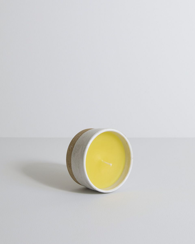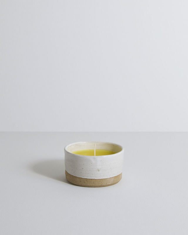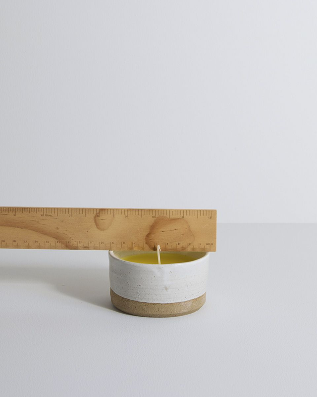 Bees wax candle in a rich toasted clay body. Hand dipped in a white gloss glazed.