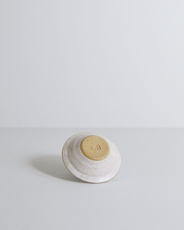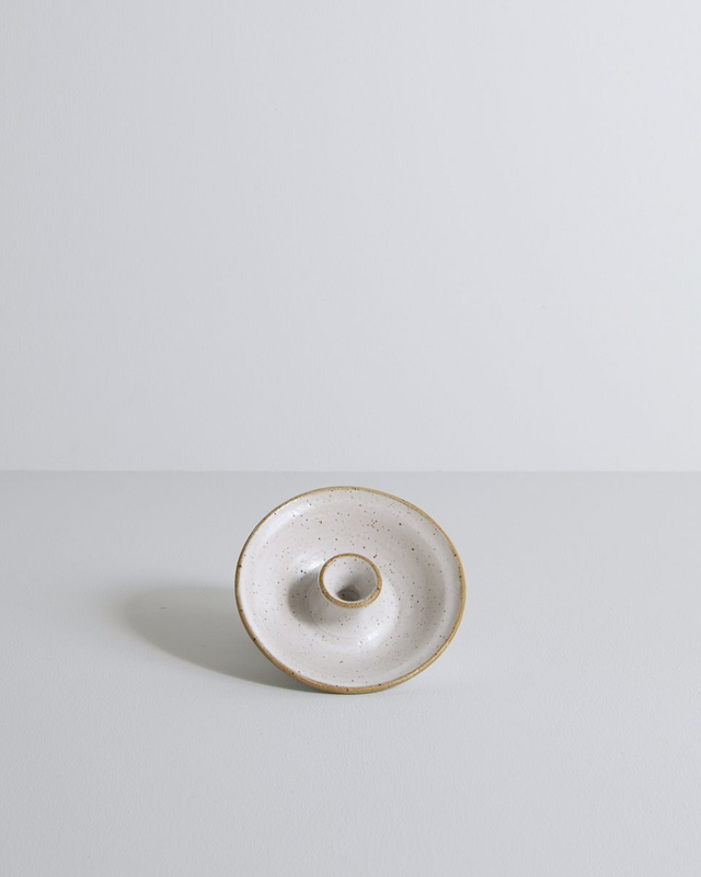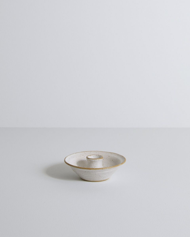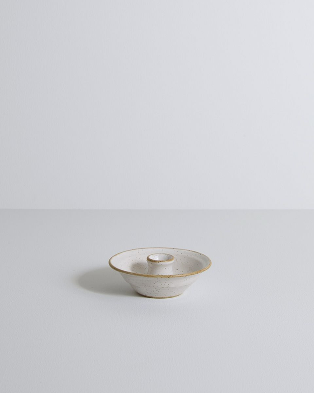 Small white speckled candle stick holder which includes 2 small beeswax candle sticks, is hand thrown using a buff clay, finished in a white gloss glaze which is then paired back on the edge to allow the clay to show through. As is the nature of hand thrown products they all have slight variations and irregularities to them which makes each product very individual and unique.
