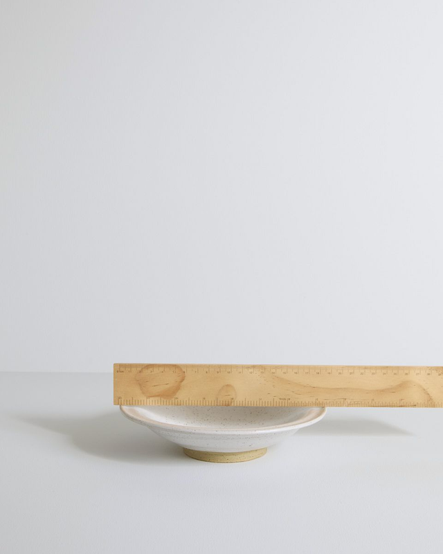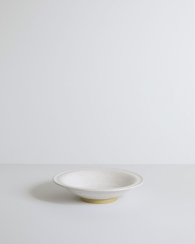 Small white speckled dish. Hand thrown on a buff clay body and finish with a white glaze that becomes speckled once fired. The dish has a pleasing foot which makes handling a delight. Due to the handcrafted nature, no two dishes are exactly the same, making each one a truly one-of-a-kind addition to your collection.