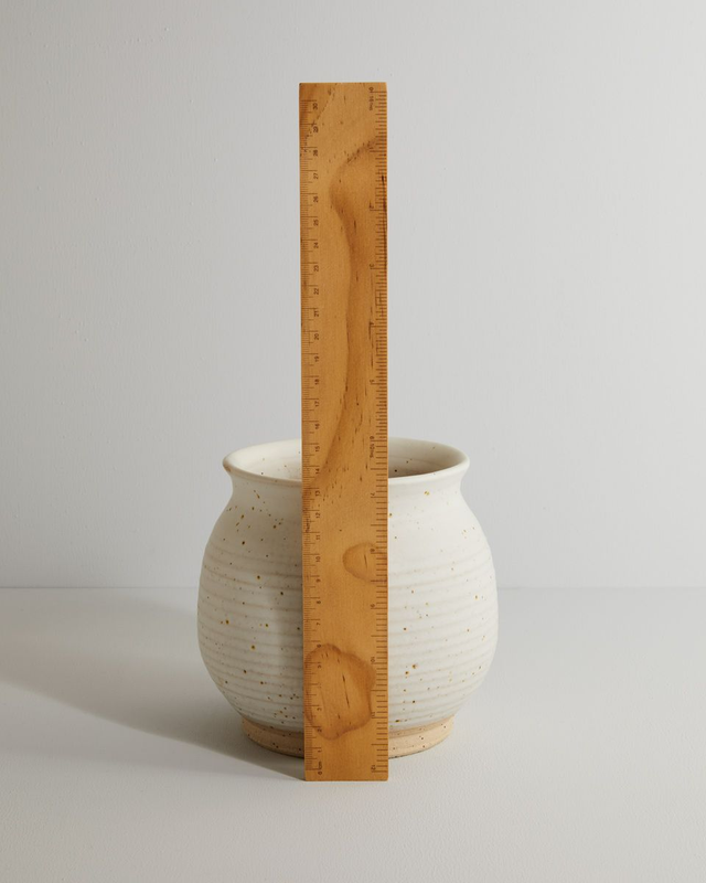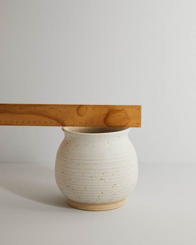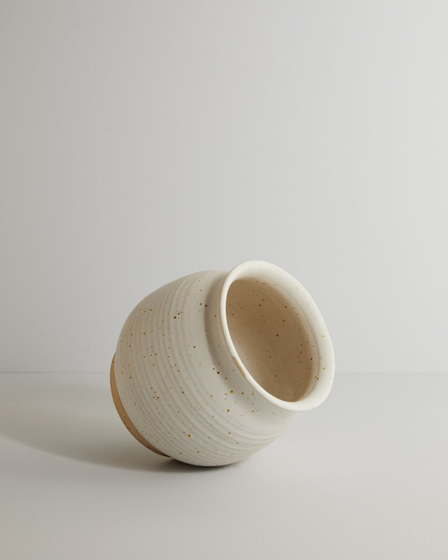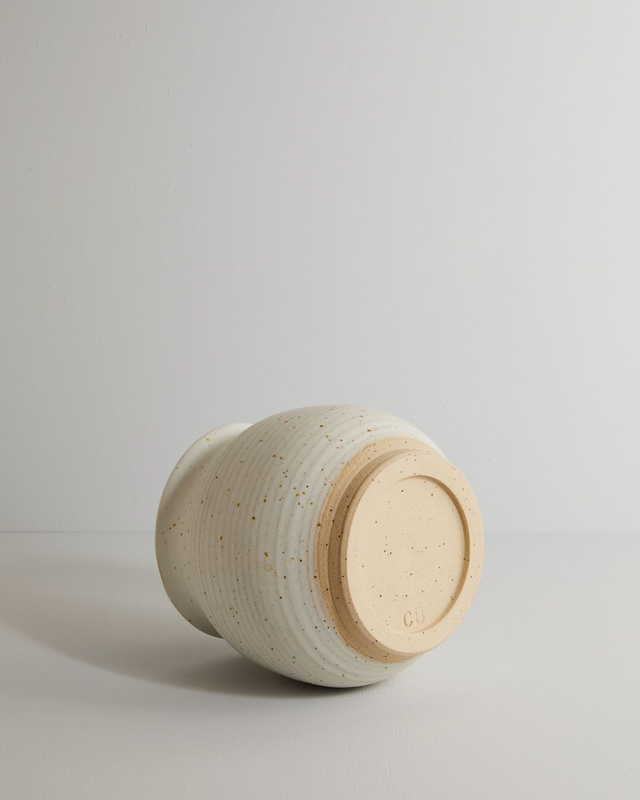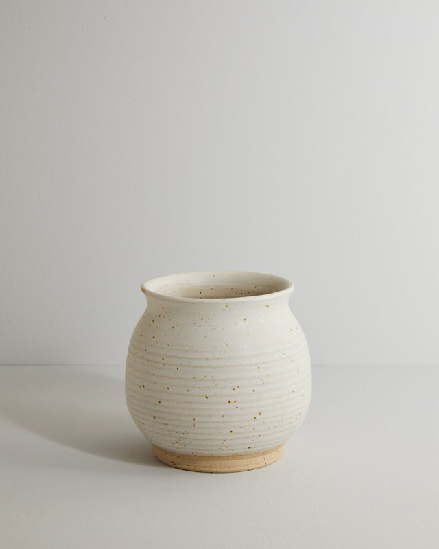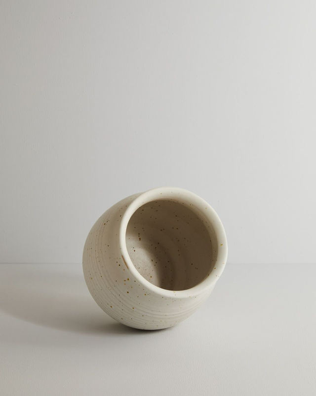 This minimalist vase is hand thrown using a speckled buff clay body and finished with a soft matte white glaze, carefully hand dipped for a clean, natural look.